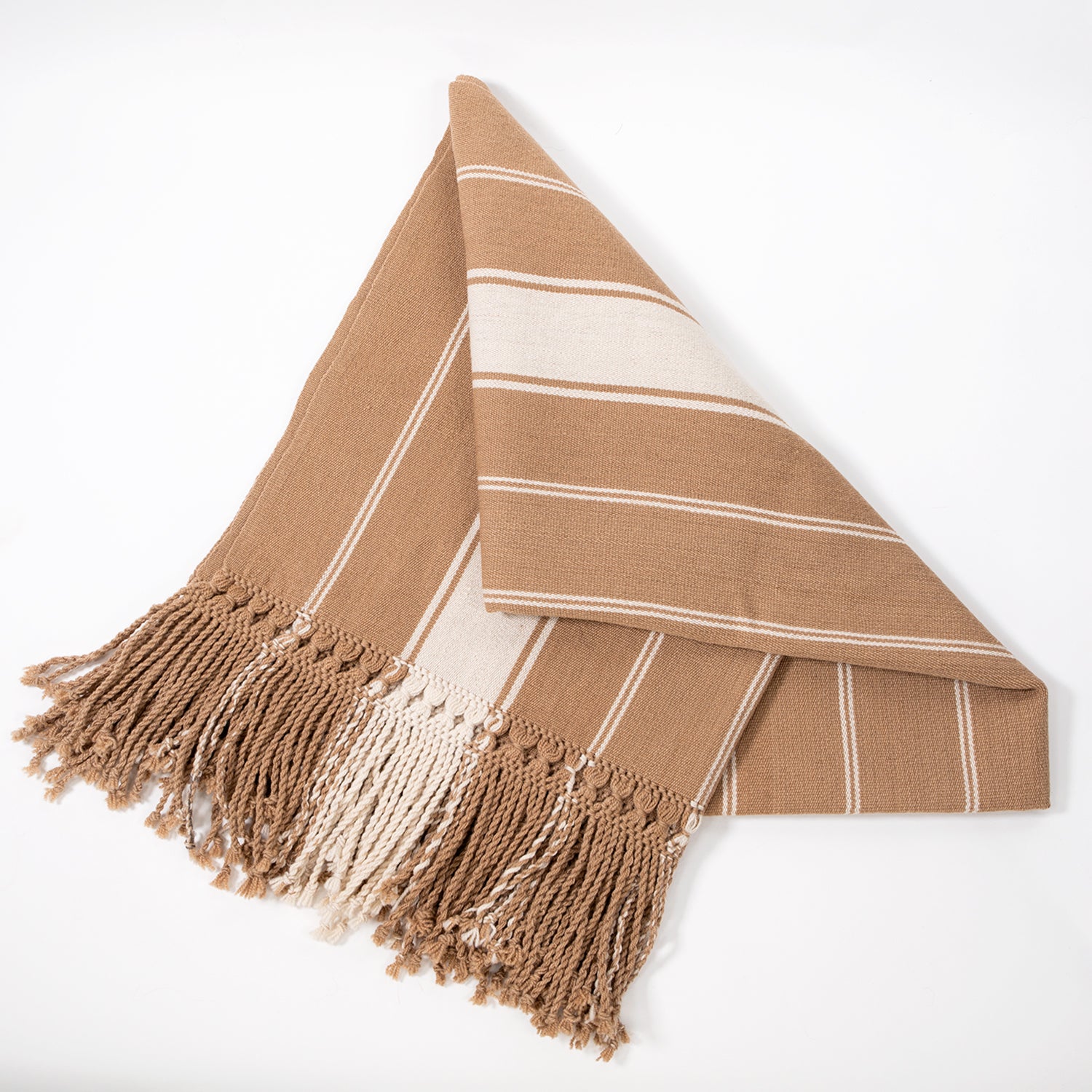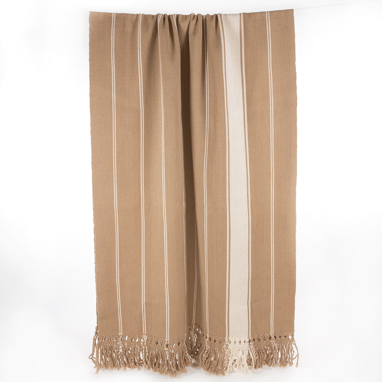 From the high desert town of Cachi, Salta, Argentina, this one-of-a-kind tan and white throw or blanket is made with 100% pure wool. With a mini-macrame tassel and fringe edge and expertly woven symmetry, this blanket carries an earthy, warming and grounding quality, a subtle and elegant design element to add to any space. Use it for interior decoration or as a beach blanket or shawl, with durability and warmth for a multitude of purposes.